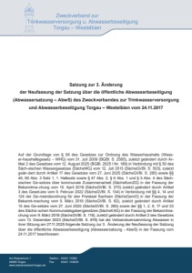 Am Wasserturm 1 04860 Torgau www.zweckverband-torgau.de Telefon: 03421 74360 Fax: 03421 743630 Satzung zur 3. Änderung der Neufassung der Satzung über die öffentliche Abwasserbeseitigung (Abwassersatzung – AbwS) des Zweckverbandes zur Trinkwasserversorgung und Abwasserbeseitigung Torgau – Westelbien vom 24.11.2017 Auf der Grundlage von § 56 des Gesetzes zur Ordnung des Wasserhaushalts (Wasser-haushaltsgesetz – WHG) vom 31. Juli 2009 (BGBl. S. 2585), zuletzt geändert durch Artikel 2 des Gesetzes vom 12. August 2025 (BGBl. 2025 I Nr. 189) in Verbindung mit § 50 des Säch-sischen Wassergesetzes (SächsWG) vom 12. Juli 2013 (SächsGVBl. S. 503), zuletzt geän-dert durch Artikel 17 des Gesetzes vom 27. Juni 2025 (SächsGVBl. S. 285) sowie §§ 46, 60 Abs. 3 Satz 1, 1. Halbsatz sowie § 47 Abs. 2, § 6 Abs. 1 und § 5 Abs. 4 des Sächsischen Ge-setzes über kommunale Zusammenarbeit (SächsKomZG) in der Fassung der Bekanntma-chung vom 15. April 2019 (SächsGVBl. S. 270) zuletzt geändert durch Artikel 3 des Geset-zes vom 9. Februar 2022 (SächsGVBl. S. 134) in Verbindung mit §§ 4, 14 und 124 der Ge-meindeordnung für den Freistaat Sachsen (SächsGemO) in der Fassung der Bekannt-machung vom 9. März 2018 (SächsGVBl. S. 62), zuletzt geändert durch Artikel 15 des Ge-setzes vom 27. Juni 2025 (SächsGVBl. S. 285) sowie der §§ 1, 2, 9, 17 und 33 des Sächsi-schen Kommunalabgabengesetzes (SächsKAG) in der Fassung der Bekanntmachung vom 9. März 2018 (SächsGVBl. S. 116), zuletzt geändert durch Artikel 2 des Gesetzes vom 13. Dezember 2023 (SächsGVBl. S. 876) hat die Verbandsversammlung Abwasser in ihrer Sitzung am 27.11.2025 folgende Satzung zur 3. Änderung der Neufassung der Satzung über die öffentliche Abwasserbeseitigung (Abwassersatzung - AbwS) in der Fassung vom 24.11.2017 beschlossen: