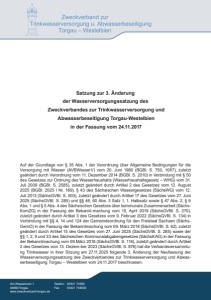 Am Wasserturm 1 04860 Torgau www.zweckverband-torgau.de Telefon: 03421 74360 Fax: 03421 743630 Satzung zur 3. Änderung der Wasserversorgungssatzung des Zweckverbandes zur Trinkwasserversorgung und Abwasserbeseitigung Torgau-Westelbien in der Fassung vom 24.11.2017 Auf der Grundlage von § 35 Abs. 1 der Verordnung über Allgemeine Bedingungen für die Versorgung mit Wasser (AVBWasserV) vom 20. Juni 1980 (BGBl. S. 750, 1067), zuletzt geändert durch Verordnung vom 11. Dezember 2014 (BGBl. S. 2010) in Verbindung mit § 50 des Gesetzes zur Ordnung des Wasserhaushalts (Wasserhaushaltsgesetz – WHG) vom 31. Juli 2009 (BGBl. S. 2585), zuletzt geändert durch Artikel 2 des Gesetzes vom 12. August 2025 (BGBl. 2025 I Nr. 189), § 43 des Sächsischen Wassergesetzes (SächsWG) vom 12. Juli 2013 (SächsGVBl. S. 503), zuletzt geändert durch Artikel 17 des Gesetzes vom 27. Juni 2025 (SächsGVBl. S. 285) und §§ 46, 60 Abs. 3 Satz 1, 1. Halbsatz sowie § 47 Abs. 2, § 6 Abs. 1 und § 5 Abs. 4 des Sächsischen Gesetzes über kommunale Zusammenarbeit (SächsKomZG) in der Fassung der Bekannt-machung vom 15. April 2019 (SächsGVBl. S. 270), zuletzt geändert durch Artikel 3 des Gesetzes vom 9. Februar 2022 (SächsGVBl. S. 134) in Verbindung mit §§ 4, 14 und 124 der Gemeindeordnung für den Freistaat Sachsen (SächsGemO) in der Fassung der Bekanntmachung vom 09. März 2018 (SächsGVBl. S. 62), zuletzt geändert durch Artikel 15 des Gesetzes vom 27. Juni 2025 (SächsGVBl. S. 285) sowie der §§ 1, 2, 9 und 33 des Sächsischen Kommunalabgabengesetzes (SächsKAG) in der Fassung der Bekanntmachung vom 09.März 2018 (SächsGVBl. S. 116), zuletzt geändert durch Artikel 2 des Gesetzes vom 13. Dezem-ber 2023 (SächsGVBl. S. 876) hat die Verbandsversammlung Trinkwasser in ihrer Sitzung am 27.11.2025 folgende 3. Änderung der Neufassung der Wasserversorgungssatzung des Zweckverbandes zur Trinkwasserversorgung und Abwasserbeseitigung Torgau – Westelbien vom 24.11.2017 beschlossen.